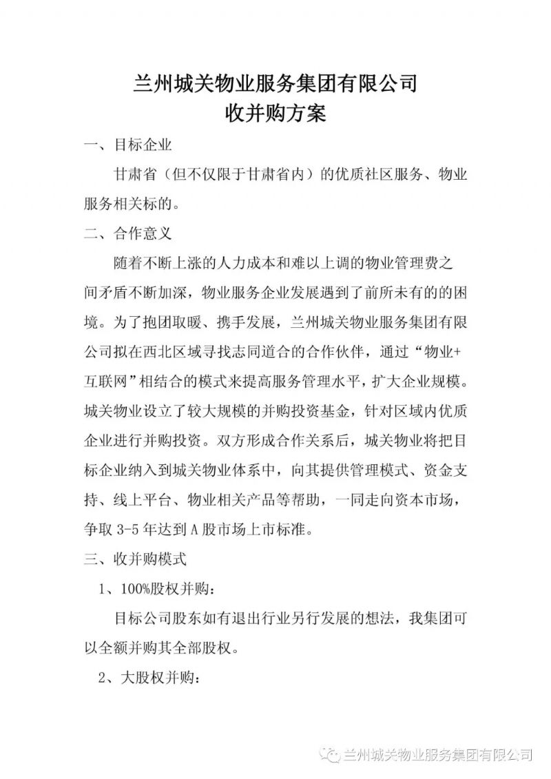 蘭州城關(guān)物業(yè)服務(wù)集團(tuán)有限公司收并購(gòu)方案