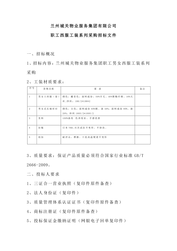 蘭州城關(guān)物業(yè)服務(wù)集團(tuán)有限公司 職工西服工裝系列采購招標(biāo)文件