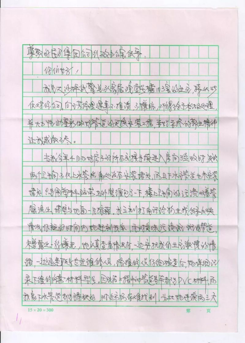 在為錢先生解決下水管道滲漏問題及安裝更換的過程中,向玉芳經(jīng)理沒有一絲推諉,沒有一句抱怨,不嫌臟亂、認真負責的工作態(tài)度得到了業(yè)主的肯定和贊譽。業(yè)主錢先生特意寫來感謝信,以此來表達對向玉芳經(jīng)理的感激之情,及對城關物業(yè)服務工作的肯定和贊揚。