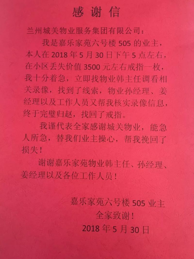 家住嘉樂家苑6號樓505的業(yè)主林女士,不慎將一枚戒指遺失在小區(qū)內(nèi)。丟失了戒指的林女士萬分著急,來到物業(yè)服務中心尋求幫助。城關物業(yè)嘉樂家苑項目部經(jīng)理韓元春得知情況后,立刻調(diào)閱查看當天監(jiān)控視頻,經(jīng)過仔細排查后找到了相關線索,并順利尋回失物,及時挽回了業(yè)主的財產(chǎn)損失?吹浇渲竿觇禋w趙后的李女士感激萬分,特將感謝信送至公司,以此表達對城關物業(yè)的贊揚。
