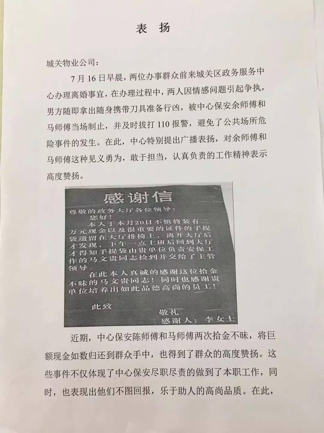 ▲城關區(qū)政務服務中心給城關物業(yè)馬文貴和余會明的感謝信