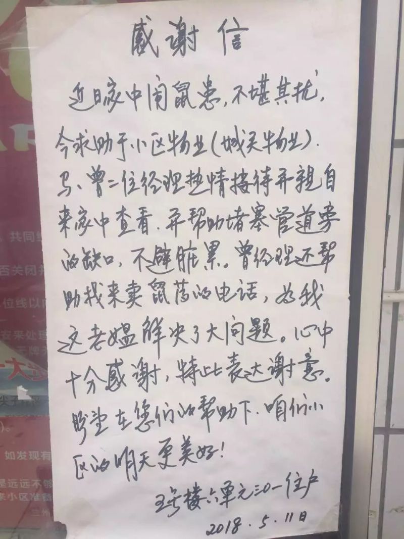 近日,市政府雁寧路小區(qū)院內(nèi)張貼的一封感謝信,引起了大家的注意。原來(lái)這封感謝信是該小區(qū)業(yè)主所寫(xiě),簡(jiǎn)單樸實(shí)的語(yǔ)言中充滿(mǎn)了對(duì)城關(guān)物業(yè)工作人員的肯定與感激,字里行間體現(xiàn)出了對(duì)我們工作的支持和認(rèn)可!