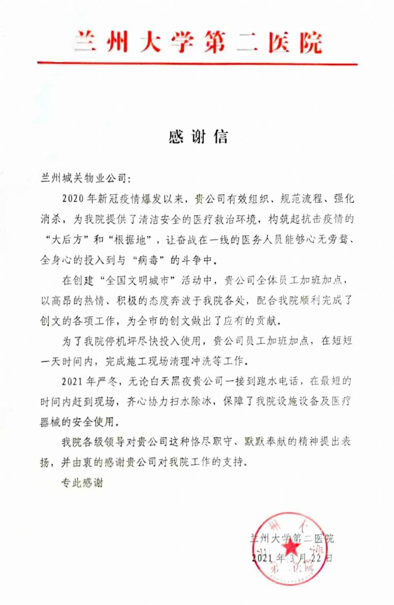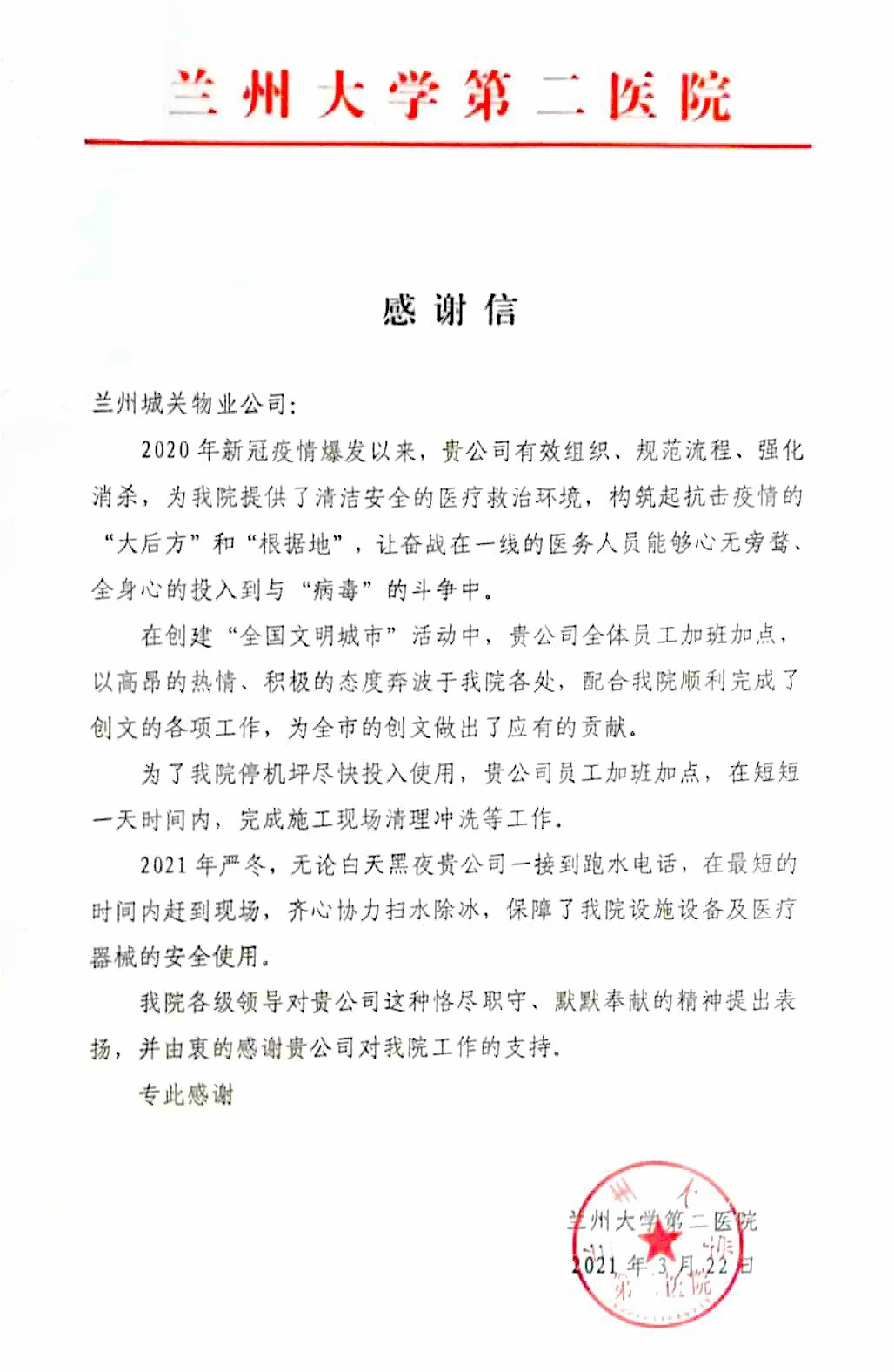蘭州大學(xué)第二醫(yī)院后勤保障處劉處長一行人專程來到蘭州城關(guān)物業(yè)服務(wù)集團有限公司,將一面寫有“物業(yè)好管家 業(yè)主貼心人”的錦旗贈予蘭州城關(guān)物業(yè)服務(wù)集團有限公司總裁楊佳林手中,以此表達對于城關(guān)物業(yè)的感謝和認可。劉處長表示,2020年新冠疫情爆發(fā)以來,城關(guān)物業(yè)有效組織,規(guī)范流程,為醫(yī)院提供了清潔、安全的醫(yī)療救治環(huán)境,與醫(yī)院一起構(gòu)筑起抗擊疫情的“根據(jù)地”。城關(guān)物業(yè)加班加點保障醫(yī)院后勤的同時,積極配合醫(yī)院順利完成各項創(chuàng)文工作,為蘭州市創(chuàng)建全國文明城市做出了應(yīng)有的貢獻。